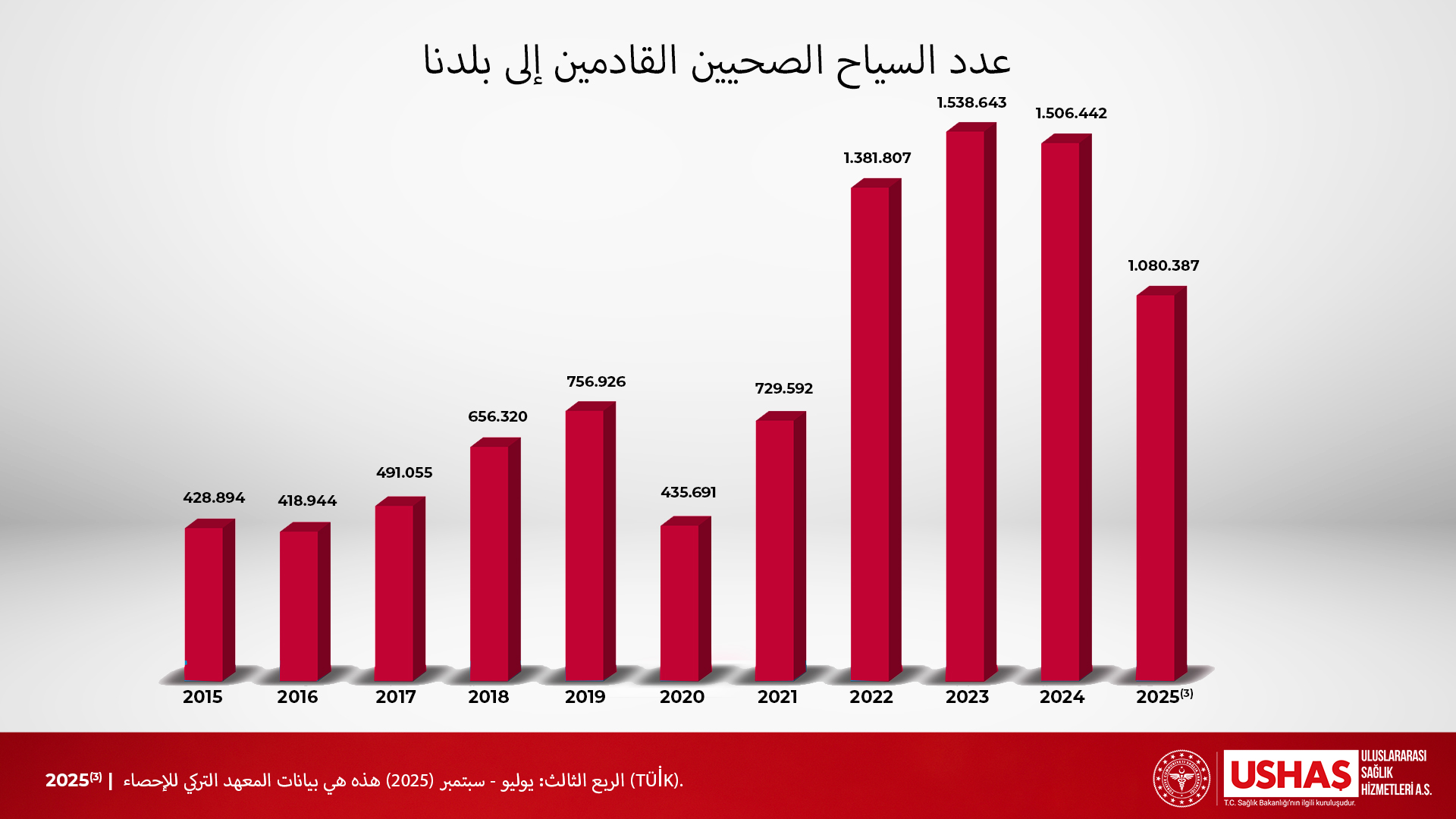 في عام 2023، سافر ما مجموعه 1,538,643 شخصًا إلى تركيا لتلقي خدمات الرعاية الصحية وبلغت الإيرادات الناتجة عن هذه الزيارات 3,006,092,006 ألف دولار أمريكي.