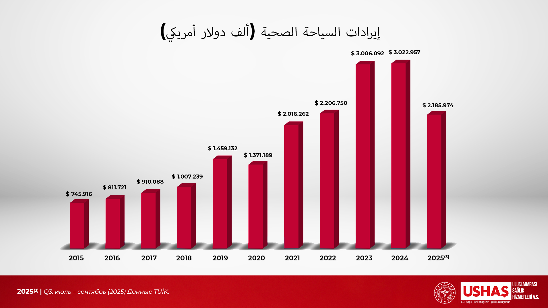 في عام 2019، تلقى 756,926 مريضًا خدمات صحية في بلدنا في نطاق السياحة الصحية والسياحة العلاجية. بلغت إيرادات السياحة من الزوار الأجانب والمواطنين المقيمين في الخارج الذين قدموا لأسباب صحية وعلاجية 1,459,132 ألف دولار أمريكي في عام 2019.